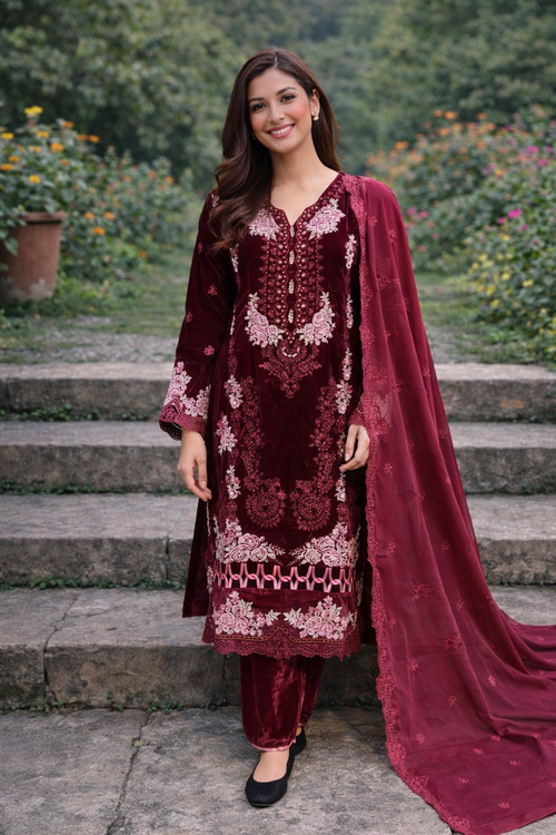 Dark Maroon Royal Velvet Embroidered 3-Piece Stitched Suit with luxurious Chiffon Dupatta
